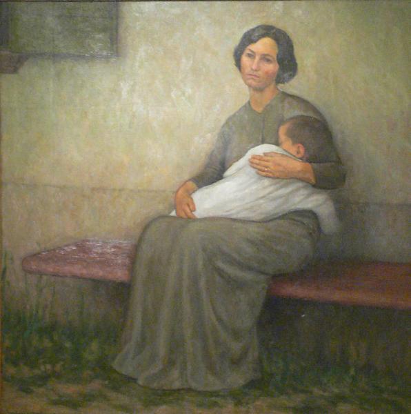 Una giovane donna è seduta su di una panca con alle spalle un muro grigio. Indossa un lungo abito grigio ed ha un bambinoin grembo, con una lunga camicia bianca che la abbraccia. Sotto la panca si scorge il verde dell'erba,