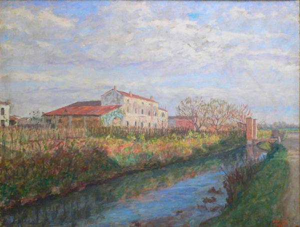 Il paesaggio è dominato, nella parte inferiore, dal taglio diagonale di un torrente di camapagna, che riflette il verde ed il giallo dell'erba che lo circonda e l'azzurro del cielo. Lungo la linea dell'orizzonte si colloca una grande casa bianca, dal tetto rosso, con parte centrale più elevata; di fronte alla casa ci sono due grandi alberi. Un ponticello con due torrette laterali collega la casa alla strada sterrata dall'altro lato. Il cielo azzurro con nuvole bianche riempie la parte superiore dell'opera.