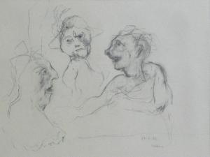 Tre uomini vengono ritratti attorno ad un tavolo. L'uomo al centro, con cappello, è in posa frontale mentre il corpo è girato a destra; le due figure laterali sono ritratte di profilo con il volto nrivolto verso il centro del quadro. Le figure sono tutte definite attraverso un segno rapido, quasi non-finito.