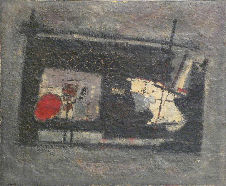Composizione astratta su sfondo grigio. Al centro vi è una grande campitura di forma rettangolare grigio scuro, all'interno di questa nella parte sinistra vi è un tondo rosso accanto a due macchie marroni sopra una figura grigio chiara di forma quadrangolare, mentre la parte destra èoccupata da una macchia di color avorio con alcune pennellate grigie e delle linee diagonali nere.