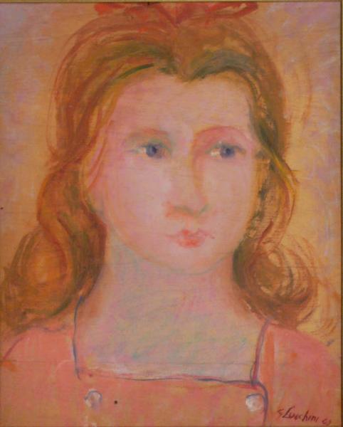 Ritratto di giovane donna dai capelli castano chiaro lunghi sino alle spalle raccolti con un nastro rosso. Il volto è rivolto verso destra. La donna indossa un abito rosa con bottoni bianchi. Dominano i colori rosati anche sullo sfondo.