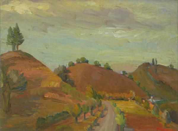 Il paesaggio è dominato dai toni marroni delle tre colline rappresentate. Sopra di esse alcuni alberi e cespugli. Una strada grigia in primo piano è fiancheggiata da campi delinaeti da elementii vegetali. Il cielo occupa la metà superiore dell'opera reso con ampie pennellate nei toni del grigio e dell'azzurro con sfumature di bianco che evidenziano la presenza delle nuvole.