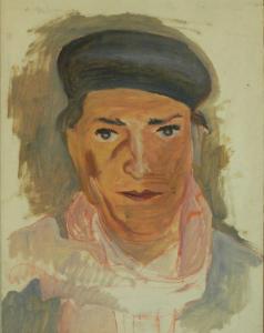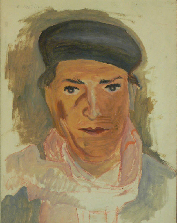 Ritratto del pittore Giuseppe Facciotto . L'uomo indossa un basco grigio scuro, sciarpa rosa e giacca grigia. Le labbra sono strette e rosse, il naso è segnato nei tratti da un profilo scuro. L'opera sembra non finita: la parte inferiore della descrizione della giacca e della sciarpa è appena accennata così come lo sfondo scuro che circonda il volto.