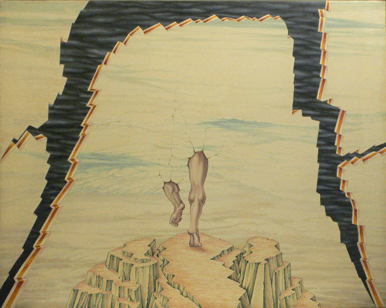 Le gambe di un uomo sono l'unico elemento del corpo ancora visibile di una figura che sta entrando in un cielo azzurro con nuvole bianche avendo come base di appoggio la cima di un monte. Il cielo è squarciato e oltre la parte azzurra si scorge un cielo nero con nuvole grigie.