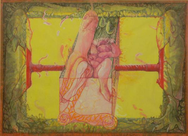 Al centro una figura seduta con capo reclinato e occhi chiusi è ripresa frontalmente ed ha gli arti superiori deformati; a sinistra la forma di un membro maschile con protome umana. Attorno alla parte centrale vi è una cornice nei toni del verde marcio con elementi fitomorfi a cui si sovrappongono due sagome di uccelli dormienti, con capo reclinato e artigli in primo piano. Tra la cornice e la parte centrale vi è una campitura gialla brillante attraversata in senso orizzontale da una colonna tortile con basamenti ampi rossa.