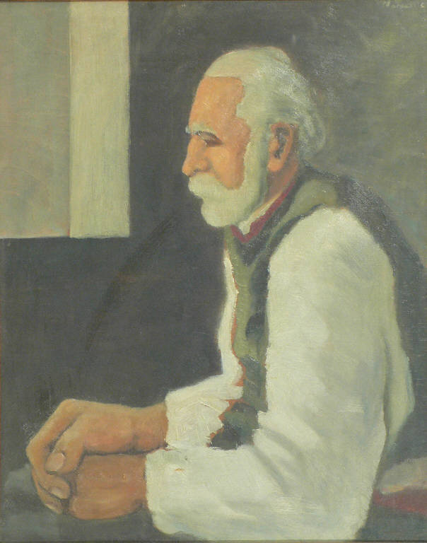 Figura di anziano seduto in interno. Nella parte alta di sinistra si nota una finestra su parete scura. L'uomo è ritratto sino alla cintola e di profilo, ha capelli, barba, baffi e sopracciglia bianche; indossa camicia bianca con profilo rosso e gilet verde. Le braccia sono sproporzionate rispetto alla costituzione dell'uomo, soprattutto le mani raccolte hanno grandi dimensioni.