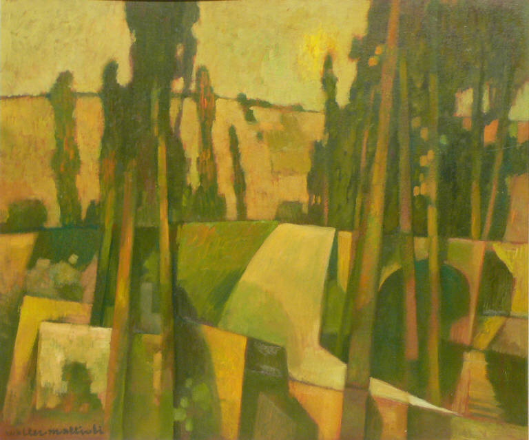 Composizione costruita attraverso il sovrapporsi di linee che delineano le colline e la vegetazione creando campiture cromatiche. Predominano le tonalità del verde e del giallo ocra.