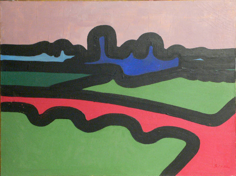 Paesaggio stilizzato costituito da grandi campiture di colore delineate da un contorno nero dello spessore di alcuni centimetri. In primo piano vi è un campo verde affiancato da una strada rossa; oltre questa strada si stendono altre due campiture verdi: più chiara quella di destra, più scura quella di sinistra. Sulla linea dell'orizzonte delle campiture blu ed azzurre definiscono lo spazio degli edifici e del paesaggio in lontananza. Il cielo è rosa.