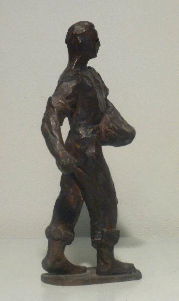 Figura di uomo nell'atto della semina. Con la mano sinistra l'uomo regge una cesta mentre con la mano destra, chiusa a pugno, è fermo poco prima di spargere le sementi. La gamba destra è posizionata davanti alla sinistra.