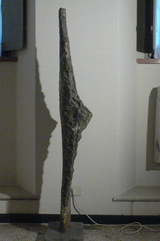 Scultura composta da un unico blocco di cemento a formare un sottile parallelepipedo allargato nella parte centrale.