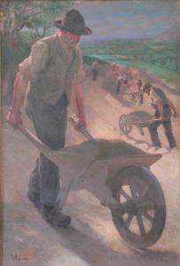 Figura maschile in primo piano con cariola. In secondo piano altri uomini hanno cariole in mano. Sullo sfondo paesaggio di campagna.