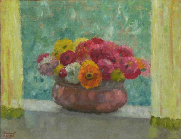 Vaso con fiori gialli, rossi , arancio e bianchi. Il vaso è collocato su di un balcone di finestra, ailati si vedono le tende gialle dal profilo inferiore verde. Lo sfondo è verde.