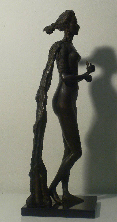 Figura di donna nuda con un fiore tra le mani. Un drappo che le cade dalla spalla destra. La gamba destra è leggermente piegata.