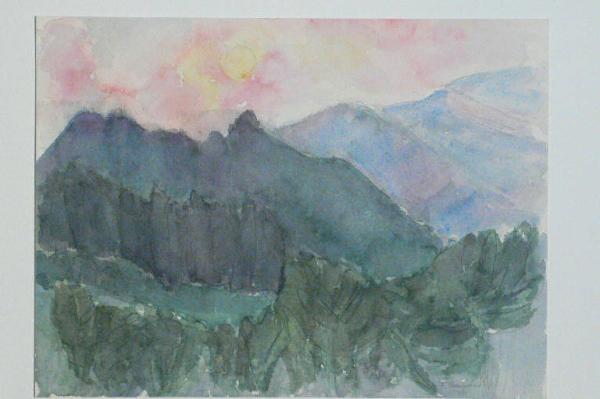 Veduta di montagne verdi. Nel cielo, nei toni dell'arancione e rosso tenue, un sole giallo.