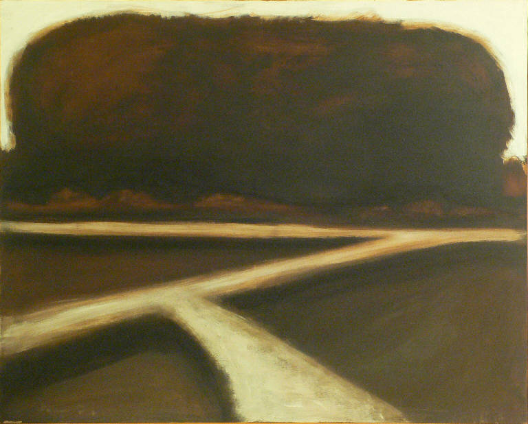 Veduta di paesaggo caratterizzato da un terreno marrone scuro attraversato da lunghe linee bianche che delineano le strade nel paesaggio. Sullo sfondo una grossa sagoma dello stesso marrone scuro si staglia contro un cielo bianco come le strade.