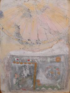 La metà superiore dell'opera è occupata dalla rappresentazione di una meridiana avente come vertice il centro del lato superiore. La metà inferiore è invece occupata da un rettangolo decorato da cerchi, rombi, quadrati colorati eda un fiore rosa nella parte sinistra.