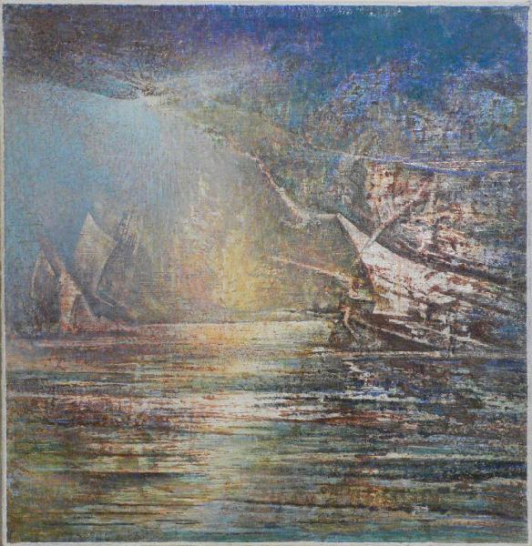 Due navi sono sul mare in un paesaggio che pare quello di una grotta marina. Una luce chiara si irradia dal centro dell'opera. Le tonalità dominanti sono quelle dei blue e degli azzurri con tratti rossi e marroni.