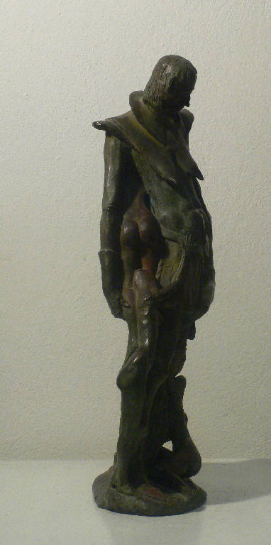 Figura di uomo con barba, capelli corti e seno. L'uomo ha un mantello lungo e braghe corte e gonfie. Cinque donne nude sono a lui avvinghiate partendo dalle braccia sino ad arrivare ai piedi.