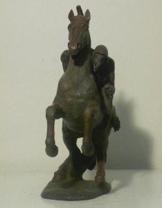 Su di un cavallo rampante si regge un uomo dalla muscolatura tonica ed in tensione con testa di uccello, dal becco lungo e indossando un elmetto. Nella mano sinistra l'uomo tiene un lundo coltello.