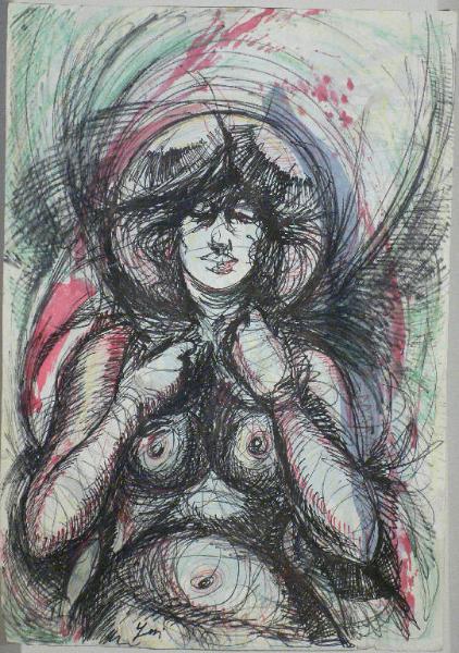 Busto di donna nuda. I profili della figura sono delineati con decisi tratti neri. Lo sfondo è rosso, verde, blu.
