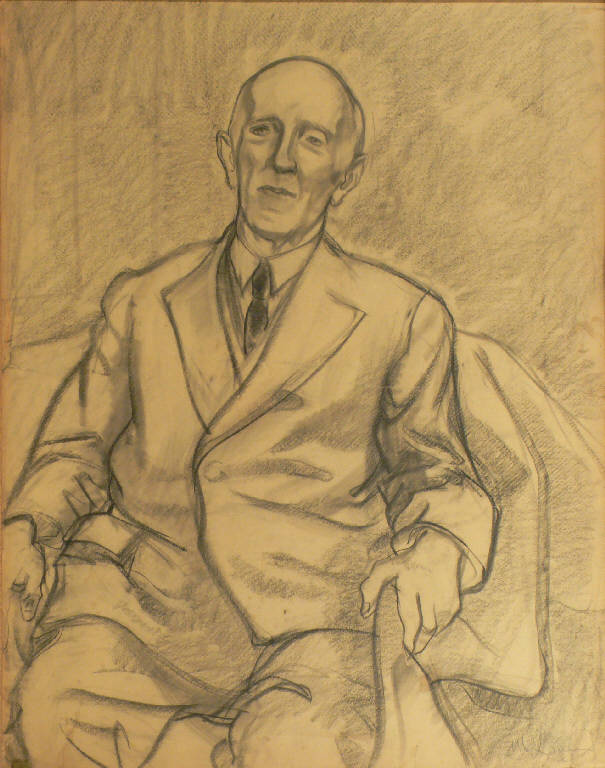 Ritratto di uomo seduto in poltrona. L'uomo ha radi capelli ed indossa un abito con cravatta