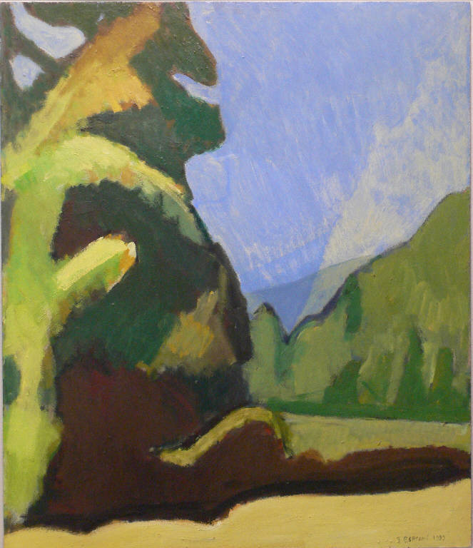 In primo piano sulla sinistra un grande albero. Sulla destra vegetazione più bassa. Sullo sfondo una montagna.
