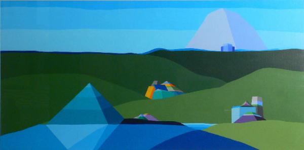 Colline verdeggianti con strutture dalle fomne geometriche e colorate che simulano montagne ed edifici. Sullo sfondo azzurro una grande montagna.