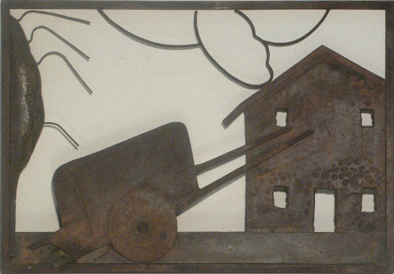 Casa con quattro finestre e porta a destra, una cariola al centro, un albero a snistra. In alto una nuvola stilizzata. Una cornicie di ferro racchiude tutto.