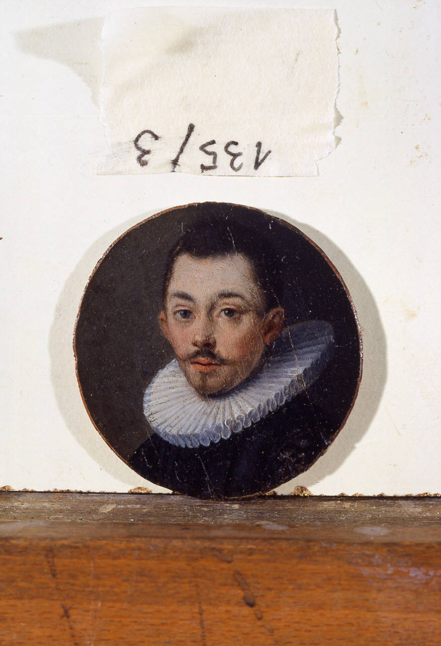 - NOTIZIE STORICO CRITICHE Il dipinto e il suo pendant (inv. 135/2) - un ritratto femminile -, furono probabilmente realizzati in occasione del matrimonio fra i due giovani, secondo una pratica che prende piede anche nel circuito borghese dei Paesi Bassi settentrionali, all'inizio del Seicento. L'autore appartiene probabilmente alla Scuola di Haarlem, come suggeriscono la pennellata estremamente sintetica e il dosaggio delle luci. L'opera proviene dalla collezione Bolognini e alla fine dell'Ottocento (1895), secondo una pratica ricorrente per l'esposizione delle "miniature" o dei dipinti di piccole dimensioni, venne sistemata all'interno di un "passe-partout" insieme agli inv. 135/2-135/11.