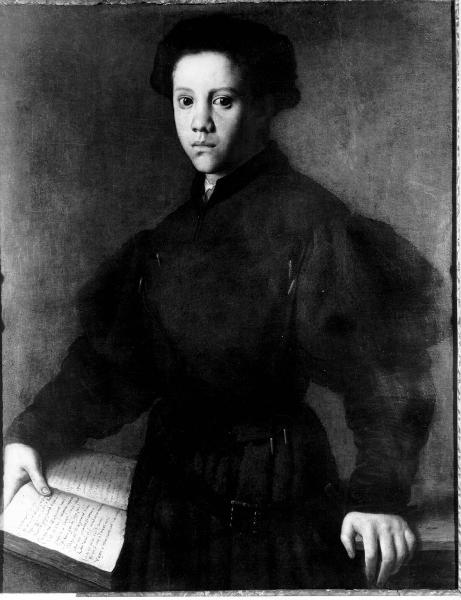 Ritratto di ragazzo a tre quarti di figura, che tiene contro il fianco destro un grande libro aperto dove sono iscritti il sonetto del Petrarca XCVI "O d'ardente virtute hornata e calda" e il sonetto di Benedetto Varchi "Famose Frondi de cui santi honori" dedicato al ritrattato. Il fanciullo ha il volto pieno e profondi occhi scuri. Indossa un abito di stoffa grezza color grigio scuro, da cui fuoriescono maniche e colletto della camicia; berretto in tinta con la giacca.