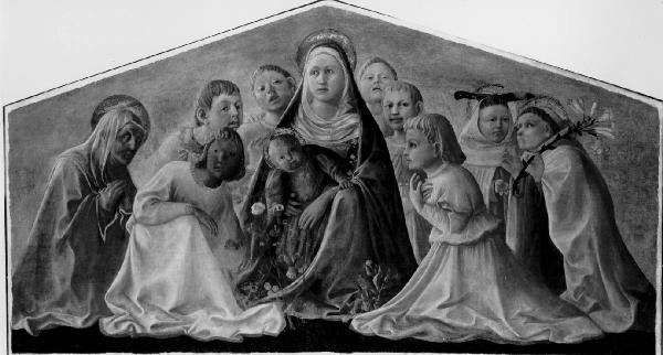 - NOTIZIE STORICO CRITICHE Anticamente l'opera era in collezione Rinuccini a Firenze e giunse a Milano grazie al matrimonio di Marianna di Pier Francesco Rinuccini con Giorgio Trivulzio nel 1831. La collezione Trivulzio venne venduta al Comune di Milano nel 1935 e da allora la lunetta appartiene alle Civiche Raccolte d'Arte. Quando l'opera era ancora in collezione Trivulzio la forma era stata regolarizzata con le aggiunte di due triangoli e trasformata in un rettangolo. Non è noto quando siano state rimosse tali aggiunte. L'opera viene trasportata su tela nel 1971 probabilmente per il cattivo stato di conservazione del supporto ligneo. L'opera risulta oggi appiattita e impoverita nella materia e nella cromia. Il dipinto è riconosciuto come uno dei capisaldi del catalogo di Filippo Lippi, prima del viaggio a Padova. Con Salmi, Toesca e Fiocco la lunetta viene messa in relazione con la "Madonna con Bambino tra angeli e santi" e con l'affresco con "Scene della vita dei monaci " del chiostro della Chiesa di Santa Maria del Carmine a Firenze. La lunetta con la "Madonna dell'umiltà" chiamata "garden type", perché seduta in un giardino, attorniata da santi carmelitani come la Santa Angela di Boemia, a sinistra, Sant'Angelo di Licata, a destra, e accanto a lui Sant'Alberto di Sicilia. Si ipotizza per l'opera una committenza carmelitana. Infatti, nella Chiesa del Carmine di Firenze,dove Filippo Lippi aveva preso i voti nel 1421 e risiedeva fino al 1432, è documentata l'esistenza di due altari dedicati a Sant'Angelo e Sant'Alberto. L'altare dedicato a Sant'Angelo era sotto il patronato dei carmelitani e proprio da qui potrebbe provenire la lunetta. Nel medesimo periodo inoltre Lippi era impegnato a dipingere l'affresco nel chiostro con "Scene della vita di monaci". Le figure di giovanetti che attorniano la Madonna sono da identificare con angeli privi di ali, che corrisponde ad una umanizzazione della divinità che caratterizza il tono generale dell'opera. La sagoma riprende quella dei dossali duecenteschi, rara nel Quattrocento. Si è ipotizzato che si trattasse della cimasa di una pala oggi frammentaria, o che il dipinto fosse destinato a rimpiazzare un dossale più antico o ancora che fosse la lunetta di un portale che poteva collegare le due cappelle menzionate. Da un punto di vista compositivo l'opera è dotata di autonomia e l'immagine destinata ad essere guardata da sotto in su, ma non ad essere collocata ad una grande altezza. L'immagine è narrativamente e compositivamente conclusa nel cerchi di figure nel quale la Madonna è il solidissimo perno. Il riferimento alla "Madonna dell'umiltà" (Wahington, National Gallery) di Masaccio è il punto di partenza per il tema, la posa e la solenne monumentalità, ma soprattutto per l'atteggiamento ieratico e umanissimo della Vergine. Vi è però anche una maggiore aderenza alla realtà che può far pensare al possibile influsso di Donatello. Ma critica è unanime nell'attribuire l'opera alla seconda metà degli anni venti. Dal 421 Filippo Lippi è ricordato nei documenti del Carmine e fino al 1431. Costituisce termine ante quem la "Madonna con il Bambino" di Domenico di Bartolo della Pinacoteca di Siena del 1433 che trae ispirazione dalla Madonna Trivulzio. (Zambrano, 1997)