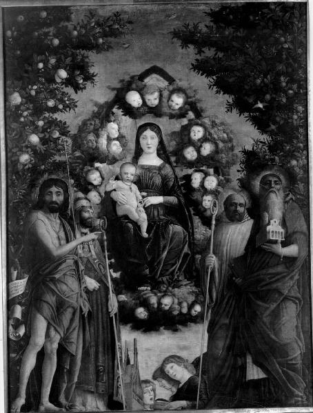 - NOTIZIE STORICO CRITICHE La tela, destinata all'altare maggiore della chiesa degli olivetani veronesi, Santa Maria in Organo reca sul foglio tenuto in mano da un angelo cantore la scritta "A. Mantinea pi.an. gracie 1497 15 augusti". Dai documenti d'archivio risultano dei pagamenti già nel 1474, quando viene incaricato il celebre intarsiatore fra Giovanni da Verona di preparare la cornice. La tela viene consegnata per la festa dell'Assunta, protettrice della chiesa nel 1497. Fin dal suo arrivo la tela è percepita come nuovo motivo di prestigio per la città. Sicuramente nel 1714 con l'intervento di rinnovamento barocco viene sostituita con l'"Assunta" di Giacinto Brandi. La pala passa a Milano nella collezione Pertusati, con una vendita del 1715. Per via ereditaria il dipinto arriva alla collezione Trivulzio, dove rimane fino al 1935 con l'acquisto da parte del Comune di Milano dell'intera collezione. (Marinelli, 1990)