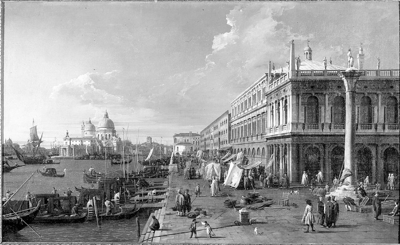 - NOTIZIE STORICO CRITICHE La tela con il suo pendant è stata acquistata presso Finarte nel 1995 con provenienza dalla collezione degli eredi di Luigi Albertini. Precedentemente le opere erano state vendute presso Christie's a Londra nel 1820, con provenienza dalla collezione dei duchi di Leeds, dove erano entrate nel Settecento probabilmente attraverso la mediazione del console inglese Joseph Smith, protettore e agente ufficiale dello stesso Canaletto, I due capolavori, portati a consocenza del grande pubblico in occadione della mostra intitolata "Splendori del Settecento veneziano" tenutasi a Venezia nel 1995, erano stati esposti nel 1929 alla mostra "Settecento italiano", sempre a Venezia. I dipinto avevano già avuto fortuna grazie alle incisioni di Antonio Visentini pubblicate nella raccolta delle vedute veneziane "Urbis Venetiarum Prospectus Celebriores del 1742. La datazione è fatta risalire al quarto decennio del Settecento e secondo Lionello Puppi la data di esecuzione sarebbe il 1735, anno in cui il IV duca di Leeds è a aVenezia e in questa occasione potrebbe avere visto e richiesto le opere. Il "pendant" esprime uno dei momenti più felici dell'inventiva canalettiana. Il colpo d'occhio dell'artista si avvale di un'impareggiabile vivacità descrittiva: la città si dispiega i una vera e propria scena di meracto all'aperto. La struttura prospettica è solida, attraverso questa l'artista offre un momento di vita restituito con un grade senso della realtà. (Magani, 2000)