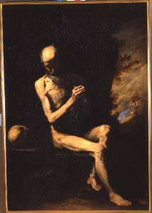 Santo eremita. Santo eremita nudo seduto presso una roccia di fianco ad un teschio