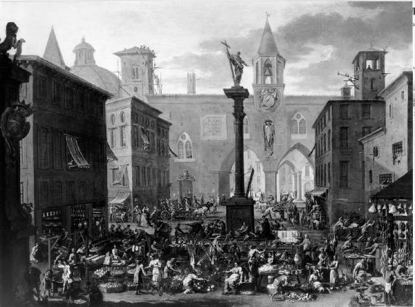 - NOTIZIE STORICO CRITICHE L'opera proviene dalla collezione del nobile milanese Camillo Tanzi, donata alle Civiche Raccolte nel 1881. Nel verbale di consegna l'opera è elencata come "Mercato del Verziere" di Magnasco. Per le sue eccezionali qualità di acuta analisi del costume contemporaneo e vivacissima scena di genere il "Mercato" ha goduto di una notorietà seconda solo all'"Intrattenimento in un giardino d'Albaro" di Palazzo Bianco. Menzionato da Jacobsen nel 1881 e nel 1915 è illustrato e descritto nel catalogo Vicenzi. Nel 1922 è esposto nella grande "Mostra della pittura italiana del Sei Settecento a Palazzo Pitti, che inaugura la fortuna espositiva del dipinto. A partire da questo momento la critica tende ad attribuire a Magnasco la realizzazione delle figure in secondo piano, la statue, i rilievi e i tocchi vivificatori sulle architetture e ad un collaboratore le architetture e le nature morte. Altri tendono a scindere il figurista e il naturamortista in due personalità distinte. La datazione è suggerita dall'accostamento al "Furto sacrilego di Campomorto" (Pospisil e Franchini Guelfi) e proposta all'ultimo anno di permanenza milanese del pittore, il 1735 circa. L'identificazione topografica è con il "Mercato del Verziere di Milano" (Franchini Guelfi). Il "Mercato" vuole essere una scena di genere di tipo fiammingo. L'identificazione è accertata dalla statua del Redentore (la "colonna infame" della peste del 1630, tuttora esistente nello slargo del Verziere, dove si teneva il mercato che ispirò i poeti dialettali milanesi. Difficile verificare la veridicità della veduta a causa delle modificazioni urbanistiche e dell'assenza di incisioni settecentesche raffiguranti il sito. Il "Mercato" è il risultato degli interventi di quattro pittori: un prospettico per le architetture, un naturamortista per le nature morte, un figurista per le figure del primo e secondo piano (ad eccezione del gruppo dei pescivendoli in primo piano che è del Magnasco) e un altro figurista, Magnasco stesso, per tutte ì le figure a partire dal terzo piano, per la statua del Salvatore, quella dell'arcangelo Michele e l'allegoria del Tempo sull'orologio, il fastigio con stemma sulla porta, le finte epigrafi, le macchiette sulle torri, le figurine e le tende alle finestre. L'opera del Magnasco si accosta all'"Assalto dei Briganti" al "Corteo Nuziale" già a Cleveland, anticipando il trattenimento genovese. E' ormai certo che sia stato eseguito a Milano, tra il 1731 e il 1733, anno della partenza per Genova, come ha accertato la ricerca d'archivio. enigma ancora aperto è lo stemma dipinto a sinistra sommariamente tratteggiato, probabilmente immaginario. (Geddo, 2001)