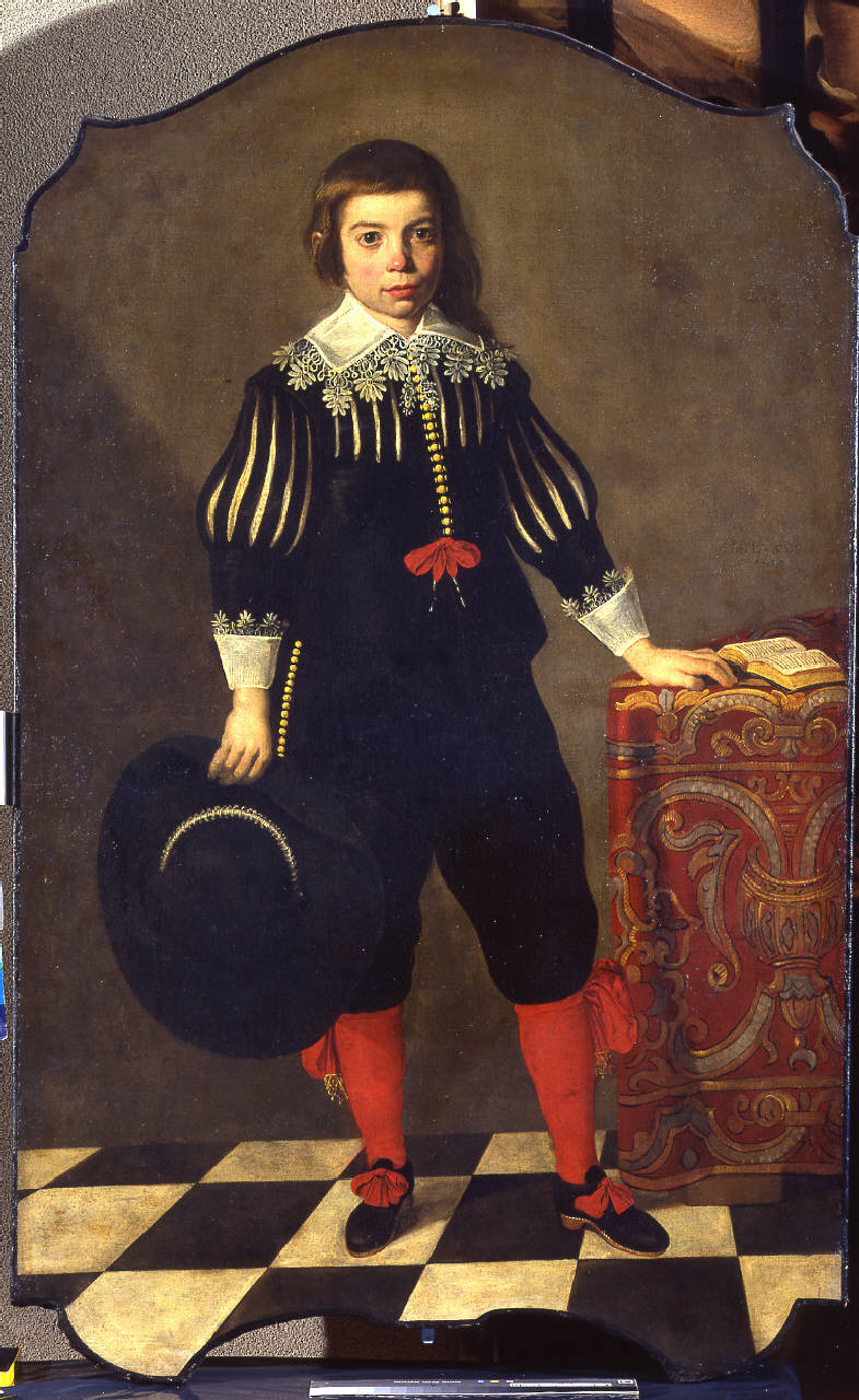- NOTIZIE STORICO CRITICHE Tradizionalmente attribuito a Carlo Ceresa (Testori, 1953; Precerutti Garberi 1970; Valsecchi 1972; Ruggeri 1973, 1979), questo bel ritratto è invece ricondotto a Daniel van den Dijck dalla Gregori (1979). Tale riferimento si basa sul confronto con un nucleo di quattro ritratti raffiguranti personaggi bergamaschi - "Giovanni Battista Bonometti" (Bergamo, casa di riposo di via Gleno), "Giovanni Battista Bonometti", "Giovanni Battista Benvenuti", "Chiara Beni Benvenuti" (Bergamo, Accademia Carrara), tutti datati anch'essi 1633, e, all'epoca dell'intervento della studiosa, ritenuti quasi concordemente del Van den Dijck. La vicenda critica del dipinto si è così allineata a quella di questo nucleo di ritratti datati 1633, il cui riferimento all'artista fiammingo è stato però confutato dal Noris (1982, 1983), soprattutto in considerazione del fatto che l'approdo in Italia del pittore fiammingo avvenne certamente non prima del 1634: una circostanza che ha convinto la Vertova (1983) e Meijer (1987) a ricondurre tutte queste opere alla giovinezza di Carlo Ceresa. Non di questo parere è Francesco Frangi (1991) che ritiene tali dipinti - questo compreso - vadano scorporati, per ragioni stilistiche, dal catalogo del pittore bergamasco. La maggiore fissità rappresentativa, oltre ad una stesura compatta e liscia, di scabra sinteticità, differenziano i ritratti del Ceresa da questo in esame, in cui si riconosce una contenuta immediatezza espressiva e l'uso di una materia pittorica pastosa e sensibile, impreziosita da tocchi di superficie e da velature trasparenti. Non è per ora possibile proporre un nome in alternativa a quello del Ceresa, ma di certo il dipinto, e gli altri ad esso affiancabili, costituiscono una preziosa traccia per identificare la presenza a Bergamo, nel 1633, di un ritrattista di notevole levatura, il cui catalogo può essere arricchito da un altro notevole inedito, cioè un "Ritratto di Giovan Battista de Consatiens", in collezione privata, e anch'esso eseguito a Bergamo, nel fatidico 1633. Considerata l'inflessione fiammingheggiante di queste opere, non va esclusa l'ipotesi che il loro illustre e anonimo autore vada riconosciuto in un artista nordico approdato in Lombardia al principio del quarto decennio del Seicento.\n\n"La collocazione "sopra la specchiera" e una fotografia (Milano, Civico Archivio Fotografico, Miscellanea fotografica, faldone 184) permettono di riconoscere la provenienza Sormani per la tela sagomata raffigurante il Ritratto di ragazzo con cappello in mano (inv. 885), datato 1633, attribuito a Pittore nordico (...)" in L. Basso, Inventari della famiglia Sormani. Terza e ultima parte., in "Libri & Documenti", XXXIV-XXXV, 2008-2009, Archivio Storico e Biblioteca Trivulziana, Castello Sforzesco, Milano, 2010, pp. 159-192, nota 107 a p. 189.