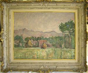 Cascinale. paesaggio campestre con alberi, casa colonica e montagne