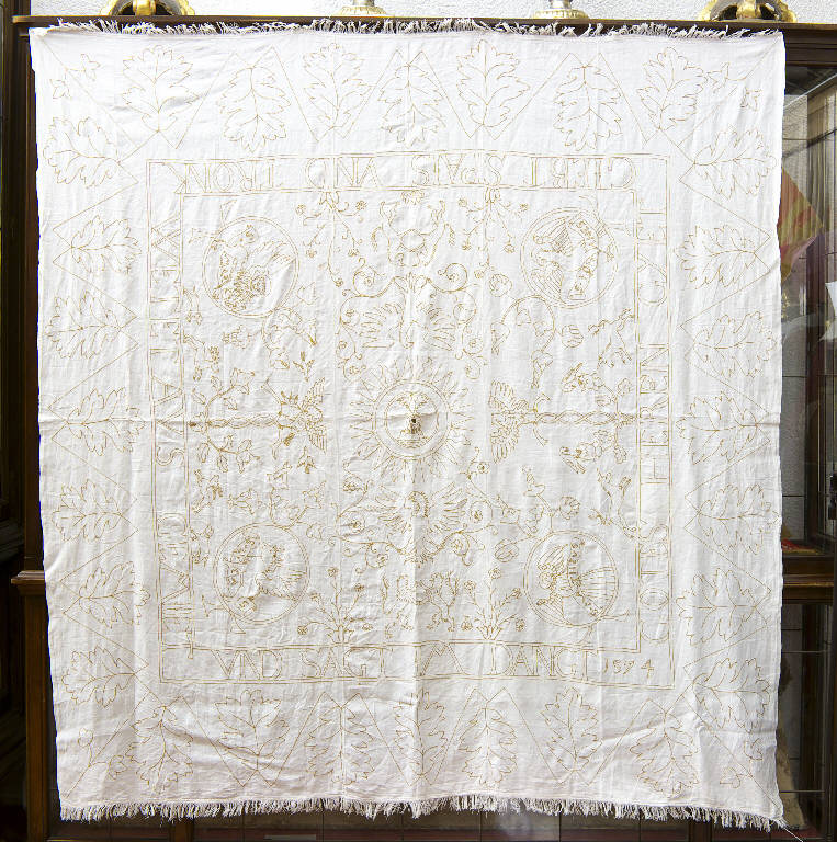 - NOTIZIE STORICO CRITICHE Questa rara tovaglia è un interessante esempio cinquecentesco di ricamo su lino di area tedesca. Lo stemma della famiglia Giovanelli attesta che il manufatto proviene dall'illustre casato gandinese, che probabilmente l'aveva fatto realizzare per proprio uso nell'ambito degli intensi rapporti commerciali instaurati con Vienna e la Germania nella seconda metà del Cinquecento. La tovaglia quadrata è ricamata a doppio punto filza e questo fa pensare che sia stata concepita a doppia faccia, con il davanti e il retro uguali. Anche se all'interno della decorazione vi sono soggetti sacri la tovaglia è destinata alla tavola domestica, come conferma anche la scritta "Il Signore Iddio dà pane e vino, fare la preghiera e dite grazie. 1574", che esorta alla preghiera prima del pranzo. Il manufatto evidenzia nella decorazione un gusto grafico e lineare basato sull'uso di un solo colore con effetto leggero e abbozzato. Questi tipi di ricami lineari su lino bianco, resi con un solo colore o al massimo due, sono caratteristici della Svizzera e della Germania meridionale dal Cinquecento fino all'inizio del Seicento ("Merletti a Gandino", p. 157). Giunta nella dotazione tessile della basilica di Gandino, dove è citata per la prima volta in un inventario del 1639, la tovaglia è stata utilizzata in tempi recenti come drappo per coprire le bare dei bambini, come documenta il foro al centro.
