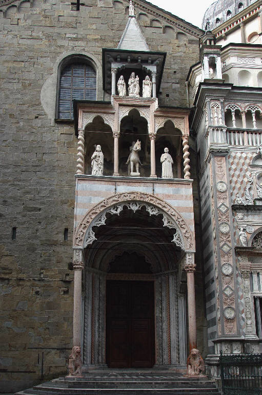 - NOTIZIE STORICO CRITICHE La presenza a Bergamo dei Maestri campionesi, maestranze di scultori, lapicidi e architetti originari della zona di Campione, ruota intorno alla fabbrica della Basilica di Santa Maria Maggiore già a partire dal XII secolo, ma si configura a livello scultoreo nel XIV secolo con la figura di Giovanni da Campione e della sua bottega. La presenza in città del maestro campionese, che in una lapide si definisce "civis Pergami" (cittadino di Bergamo), è documentata a partire dal 1340, quando venne chiamato a realizzare all'interno della basilica mariana un Battistero oggi eliminato e parzialmente reimpiegato nell'attuale edificio battesimale nei giardini dell'Episcopio. La sua attività si concentrò poi nell'adattamento gotico della basilica con la costruzione e la decorazione scultorea dei protiri sulle facciate nord e sud. Verso il 1350, probabilmente, maturò la necessità di dare alla fronte settentrionale del transetto della Basilica l'aspetto di una vera e propria facciata: si spiega così la scelta di costruire una struttura monumentale conosciuta come Protiro dei Leoni Rossi, sontuosa già nei materiali riccamente policromi e ornata di un esuberante apparato decorativo, e di affidare l'impresa a Giovanni da Campione, maestro ben noto ai committenti per aver condotto, qualche anno prima, il cantiere del Battistero. La critica recente, sulla scorta di una intuizione che fu già di Baroni, assegna a Giovanni da Campione un ruolo essenzialmente di progettista e di supervisore dei lavori, più che di esecutore diretto di opere scultoree, con l'eccezione del Sant'Alessandro a cavallo, firmato, e delle statue poste nelle logge superiori del Protiro dei Leoni Rossi, in gran parte riferibili alla sua stretta cerchia. Giovanni guarda ai modelli della tradizione romanica di area lombarda e veneta e in particolare, come è stato spesso sottolineato, agli esempi delle Cattedrali di Verona, Ferrara e Cremona. \nIl protiro meridionale, detto convenzionalmente "dei Leoni Bianchi", è stato realizzato da Giovanni da Campione e dalla sua bottega attorno al 1360; questa è la data che compare nell'epigrafe posta sopra l'arco a sinistra, che conserva anche la firma di Giovanni. E' verosimile pensare che, mentre ancora erano in corso i lavori all'ingresso settentrionale, i committenti già pensassero di dotare l'accesso meridionale di una analoga struttura monumentale, come documenta la perfetta identità, a meno del materiale, tra le due coppie di leoni stilofori (Lomartire, 2009, p. 71-75). Non si notano, in effetti, variazioni stilistiche di rilievo tra i due protiri: Giovanni sceglie una struttura più semplice e limita l'apparato decorativo agli architravi e alle mensole scolpite con figure di animali fantastici, teste umane e ornati vegetali : ma gioca allo stesso modo con la policromia delle superfici, in marmo bianco, rosso e nero, e guarda agli stessi modelli (Lomartire, cit.). Il progetto prevedeva sicuramente, anche in questo caso, come già era avvenuto per il protiro settentrionale, una struttura complessa, svolta su più livelli: ma i lavori furono interrotti, non sappiamo per quale motivo; e il compito di allestire la guglia, utilizzando statue già scolpite nella bottega di Giovanni spetterà, all'inizio del XV secolo, allo scultore tedesco Hans von Fernach, detto "Anex de Alemania (Lomartire, cit., p. 74). \nInfine tra il 1364 e il 1367 Giovanni realizzò, con l'aiuto del figlio Nicolino, il portale sul fronte settentrionale. Giovanni da Campione sceglie, per questo ingresso minore, una struttura semplice, che ripete per il portale il modello consueto della tradizione romanica lombarda, a forte strombo e cordonature multiple; insolito, invece, e forse derivato da esempi veneti conosciuti per il tramite degli edifici bresciani, il coronamento dal profilo ad arco inflesso, ornato ai lati dalle statue di San Giovanni Evangelista e della Madonna Addolorata e, al centro, da un Cristo crocifisso con angeli intagliato in una spessa lastra di marmo, tutte certamente eseguite, per l'alta qualità, da Giovanni o da un suo stretto collaboratore; la lunetta ospita una "Natività della Vergine" di fattura trascuranta e d'aspetto piuttosto arcaizzante, da assegnare alla bottega del maestro (Lomartire, cit.). \nNel 1839 fu trasportato in basilica il monumento funebre al cardinale Guglielmo Longhi, proveniente dalla chiesa del soppresso convento di S. Francesco. L'opera, che sarebbe stata commissionata dallo stesso cardinale poco prima di morire nel 1319, è riferita tradizionalmente a Ugo da Campione, padre di Giovanni, la cui attività è tuttavia poco nota. Lo scultore del monumento, chiunque egli sia, è comunque molto vicino ad uno dei due maestri principali che realizzarono le nove sculture della Loggia degli Osii a Milano, con cui condivide il tono di gravitas solenne e i modi ancora assai legati alla tradizione tardoromanica.