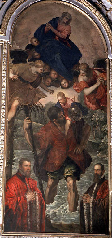 - NOTIZIE STORICO CRITICHE Probabilmente proveniente dalla raccolta di Brera, che custodiva le opere confiscate nelle soppressioni napoleoniche, la tela fu acquistata dalla Fabbriceria San Martino intorno al 1820-1821. Secondo la ricostruzione fatta da M. Pittaluga, doveva essere la pala dell'Oratorio della Confraternita dei Mendicanti di Venezia. Non si sa come giunse ad Alzano, ma si ipotizza un coinvolgimento di don Giuseppe Bongiani, che aveva ottimi rapporti con il governo austriaco allora in carica. La tela raffigura l'episodio della conversione di San Cristoforo. Secondo la versione popolare della vicenda, tratta dalla Legenda Aurea di Jacopo da Varagine, Cristoforo era un cananeo di statura gigantesca. Dopo essere stato al servizio del demonio, decise di seguire Cristo e, guidato da un eremita, si dedicò a trasportare i poveri e i deboli al di là del fiume. La scena rappresenta il momento culminante: Cristoforo, che sta sprofondando nell'acqua, si volta per osservare il bambino che ha sulle spalle, sorreggendosi con la mano destra al suo bastone, un tronco di palma. Il fanciullo lo invita a proseguire, indicandogli la via per la salvezza. Dopo aver raggiunto con grande fatica la sponda opposta, il Bambino si rivela essere Cristo e dice al santo che quella notte ha portato sulle spalle il peso del mondo, ben esemplificato dal globo retto tra le mani. Secondo uno schema cinquecentesco, assistono alla scena la Madonna, le cui vesti sono della stessa tonalità di quelle del Bambino, e due dignitari della corte dogale, riccamente abbigliati, committenti dell'opera. Già assegnato alla bottega di Jacopo Tintoretto, è oggi attribuito alla mano del grande maestro veneziano. La pennellata energica, le forme sempre più solide e potenti e il senso della luce, concepita come formula espressiva drammatica, consentono di riferire il dipinto ad una fase matura, molto probabilmente intorno al 1575.