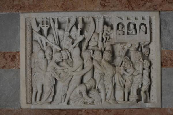 Il rilievo non raffigura una scena unitaria ma sovrappone momenti cronologicamente distinti. Questi si dispongono da sinistra a destra, su un unico registro, secondo una sequenza narrativa che vede Cristo sempre protagonista. In una metà del rilievo è raffigurato il "Bacio di Giuda", circondato da uomini con volti deformi che ben evidenziano la tragicità del momento, mentre nell'altra metà si susseguono la "Condanna" e la "Flagellazione" alla colonna. In basso al centro, è descritto il curioso episodio avvenuto durante la cattura di Cristo, in cui Pietro taglia l'orecchio al servo del sommo sacerdote. Il bassorilievo è chiuso su tre lati da un'elegante cornice che ripete un motivo decorativo a foglie ricurve.