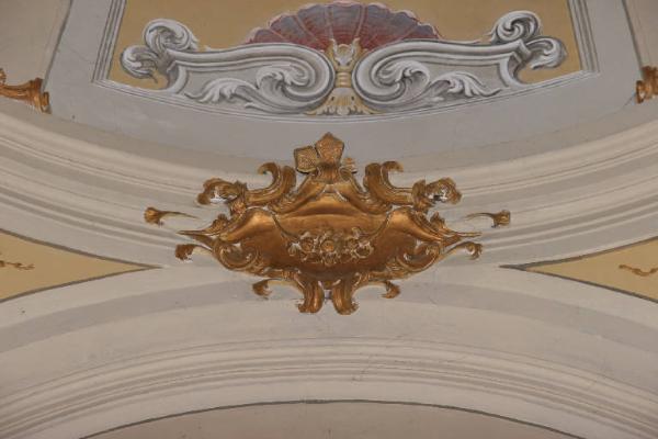 Cartella in stucco dorato con motivi a girali.