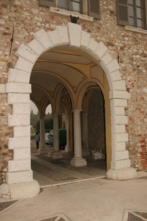 Portale con arco a tutto sesto con pietre bugnate che si alternano nello sporgere. La chiave di volta è a corpo liscio