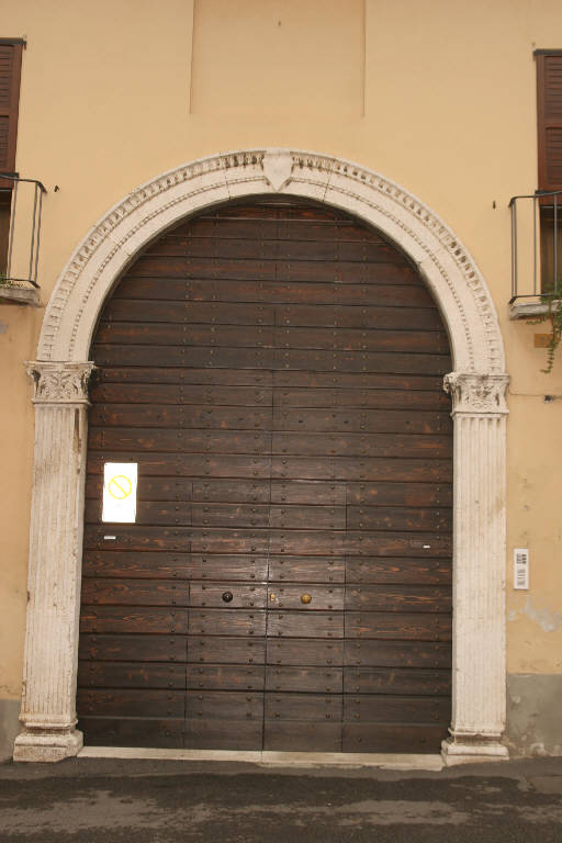 Portale con arco a sesto ribassato retto da pilastri a fusto scanalato e sormontati da capitello a folgie d'acanto e volute angolari. La ghiera presenta due motivi decorativi sovrapposti, l'inferiore a ovati e quello superiore a fusarole. La chiave di volta presenta uno scudo liscio a testa di cavallo.