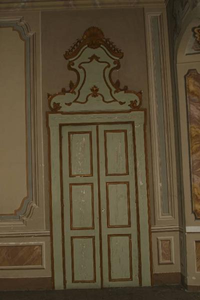 Mostra di porta architravata sormontata da cimasa curvilinea con motivo a valva di conchiglia apicale.