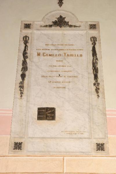 Lapide di forma rettangolare sormontata da cimasa curvilinea e inserzioni decorative in ferro battuto a ghirlande vegetali. Il manufatto reca al centro iscrizione incisa di carattere commemorativo ed è fissato alla parete da quattro borchie metalliche in forma di girali vegetali.
