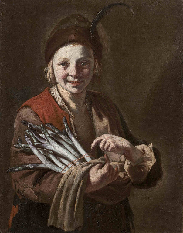 - NOTIZIE STORICO CRITICHE Il dipinto è acquistato da Luigi Lechi nel 1975 presso il restauratore Benito Podio come opera di Giacomo Francesco Cipper detto il "Todeschini". L'artista deve la propria fortuna a scene di genere complesse e articolate, gremite di povere genti che dialogano tra loro mediante una caricata gestualità oppure ritratte singolarmente. Significativi per l'interpretazione del dipinto sono il gesto con cui la figura, in atteggiamento giulivo, indica con la mano sinistra il mazzo. I brani di natura morta assumono infatti nella produzione del Todeschini precise valenze simboliche. Se nel XVIII secolo l'asparago selvatico era un cibo popolare, i grandi asparagi indicati dal ragazzo erano riservati alle tavole delle classi più agiate, forse a sottolineare la chiara dicotomia tra l'esclusività del cibo e la modesta condizione del giovane. Nell'opera in esame appare ardua l'interpretazione univoca del suo significato allegorico, in quanto il consistente mazzo potrebbe essere un semplice augurio d'abbondanza o un'allegoria della primavera, stagione di produzione dell'asparago, anche se non si può escludere un più complesso richiamo a significati ludici oppure erotici. Del medesimo soggetto sono note altre due versioni: una pubblicata in Collezioni Private Bergamasche (II, 1981, p. 403) ed un'altra ancora sul mercato antiquario.