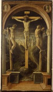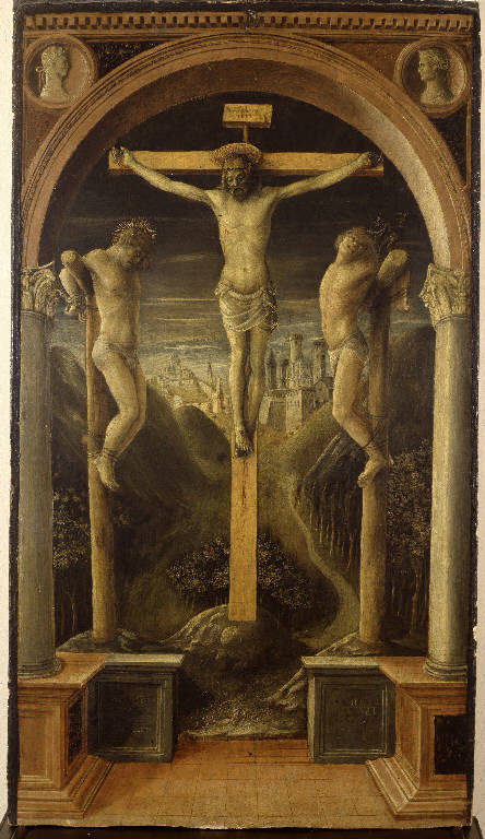 - NOTIZIE STORICO CRITICHE Si ignora l'originaria collocazione dell'opera, che fu citata per la prima volta dal conte Giacomo Carrara in una lettera del 1764 all'erudito Giovanni Bottari, subito dopo l'acquisto del dipinto probabilmente sul mercato antiquario bergamasco. Carrara si dichiara entusiasta del dipinto perché tavola originale del Foppa, firmata e datata, e per la suggestiva soluzione della storia sacra inquadrata entro un arco, dipinto in primo piano. Per le piccole dimensioni e per il soggetto l'opera, sulla quale è inciso il tracciato prospettico, era probabilmente destinata alla devozione privata come stimolo e supporto alla preghiera individuale. Si tratta della prima opera firmata e datata del pittore e fornisce anche una preziosa indicazione sulle sue origini bresciane. L'aggiornamento alle novità toscane nella resa spaziale prospettica e nell'evidenza plastica dei corpi è stato quasi sempre sottolineato dalla critica in rapporto al clima artistico padovano del tempo, rinnovato da Donatello, presente nella città veneta dal 1443 al 1453. Roberto Longhi (1929, 1942), oltre a questi elementi, evidenzia i caratteri specifici lombardi da individuarsi soprattutto nell'uso particolare della luce. Marisa Dalai Emiliani (1971) mette in evidenza l'interpretazione personale delle leggi della prospettiva geometrica toscana, applicate da Foppa con deroghe dovute a motivi simbolici, come emerge dalle proporzioni ingigantite della figura di Cristo rispetto a quelle dei ladroni. Generalmente accettata come 1456, la lettura della data apposta sul dipinto ha talvolta destato qualche perplessità fino a essere messa in dubbio da Giovanni Agosti (1990, 1997) che vi legge l'anno 1450, giudicato più convincente anche da Giovanni Romano (2003). Questa data infatti corrisponderebbe meglio al grande impatto suscitato dall'Altare del Santo, scolpito da Donatello a Padova a partire dal 1446 e scoperto nel 1450. Oltre all'influsso di Jacopo Bellini nel partito decorativo e architettonico e di Gentile da Fabriano nel fiabesco paesaggio sullo sfondo, quest'opera è infatti soprattutto debitrice della vibrante luminosità e del plasticismo drammatico dei corpi delle opere di Donatello.