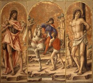 - NOTIZIE STORICO CRITICHE Scomparto di polittico, laterale sinistro inferiore. L'opera è firmata. Così recita il documento del 1768 del Carrara: "Ancona di Torre Boldone in tre partimenti sull'asse. In quello a sinistra S. Gio. Batta intiero in piedi coll'agnello in mano in quello a destra S. Sebastiano pure in piedi e in quello di mezzo S. Martino a cavallo che da la veste al povero in paese soto il quale in cartello sta scritto Hoc opus facto per Bartholomeu vivarini da Muriano 1491" e così descrive il Borsetti: "S. Giovanni Battista, opera di Bartolomeo Vivarini da Murano". Trittico a tre archi a tutto sesto. Giacomo Carrara acquistò l'opera dalla chiesa di Torre Boldone. La cornice è databile al sec. XVIII ed è in legno modanato e dorato. Di questo scomparto esistono due varianti dello stesso autore: "San Giovanni Battista", Venezia, Chiesa di San Giovanni in Bragora; "San Giovanni Battista", Firenze, Collezione Contini Bonaccossi.