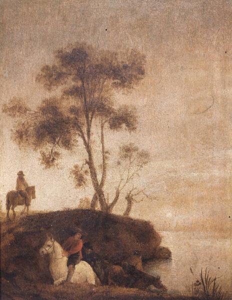 Paesaggio lacustre con cavalieri